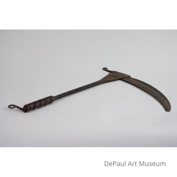 Scythe-like ceremonial knife with decorative incising along blade.Artwork Details