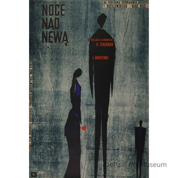 Polish film poster for Noce Nad Newa. Three abstract black figures of different heights stand against a blueish-grey background. The title for the film is written in bold black text in the top left corner. Russian film poster. Cinema.