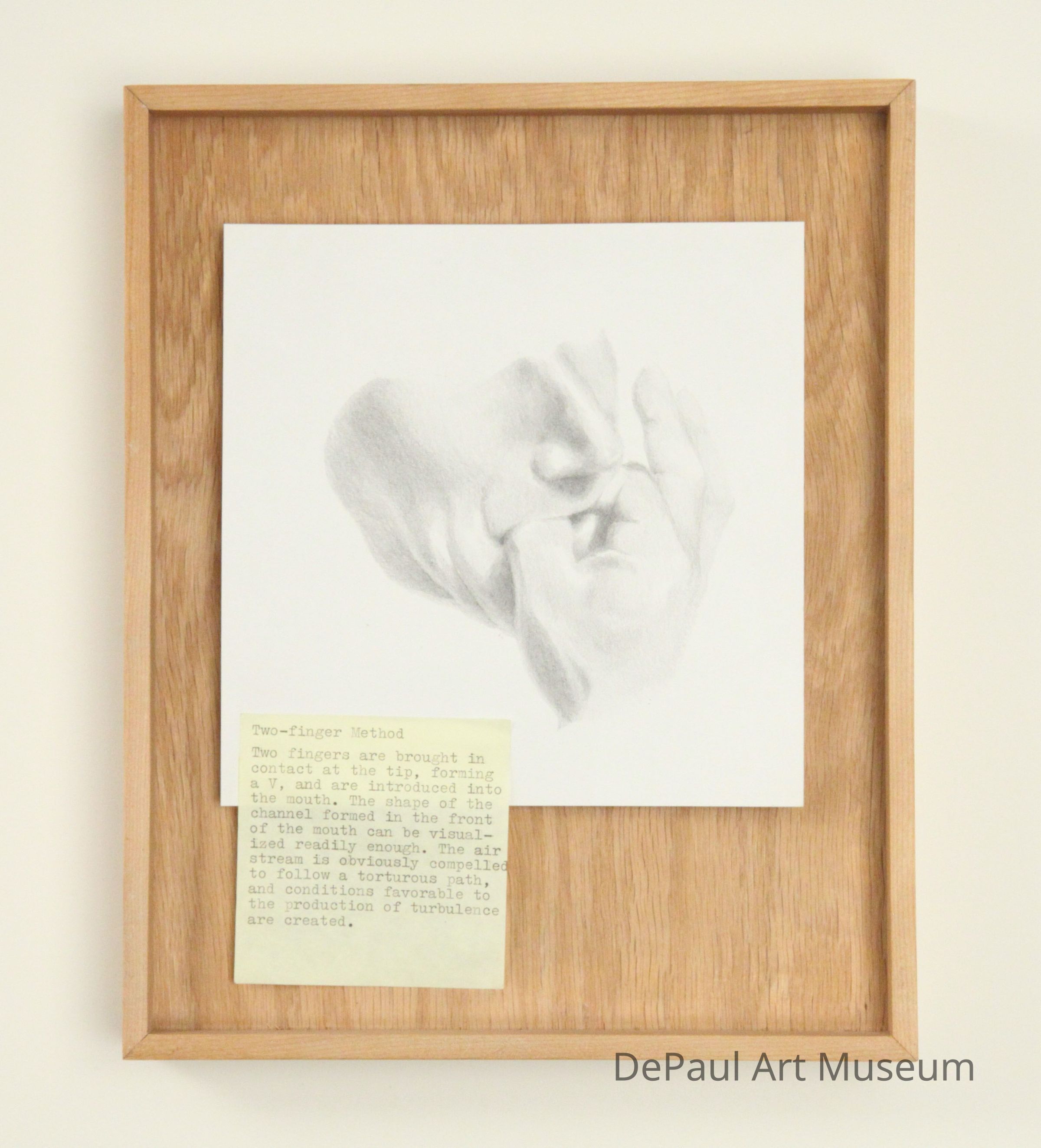 Drawing of a person whistling using their thumb and pointer finger. Below the drawing is a yellow post-it note describing the "two-finger method" for whistling. The note on the post-it is typed.Artwork Details