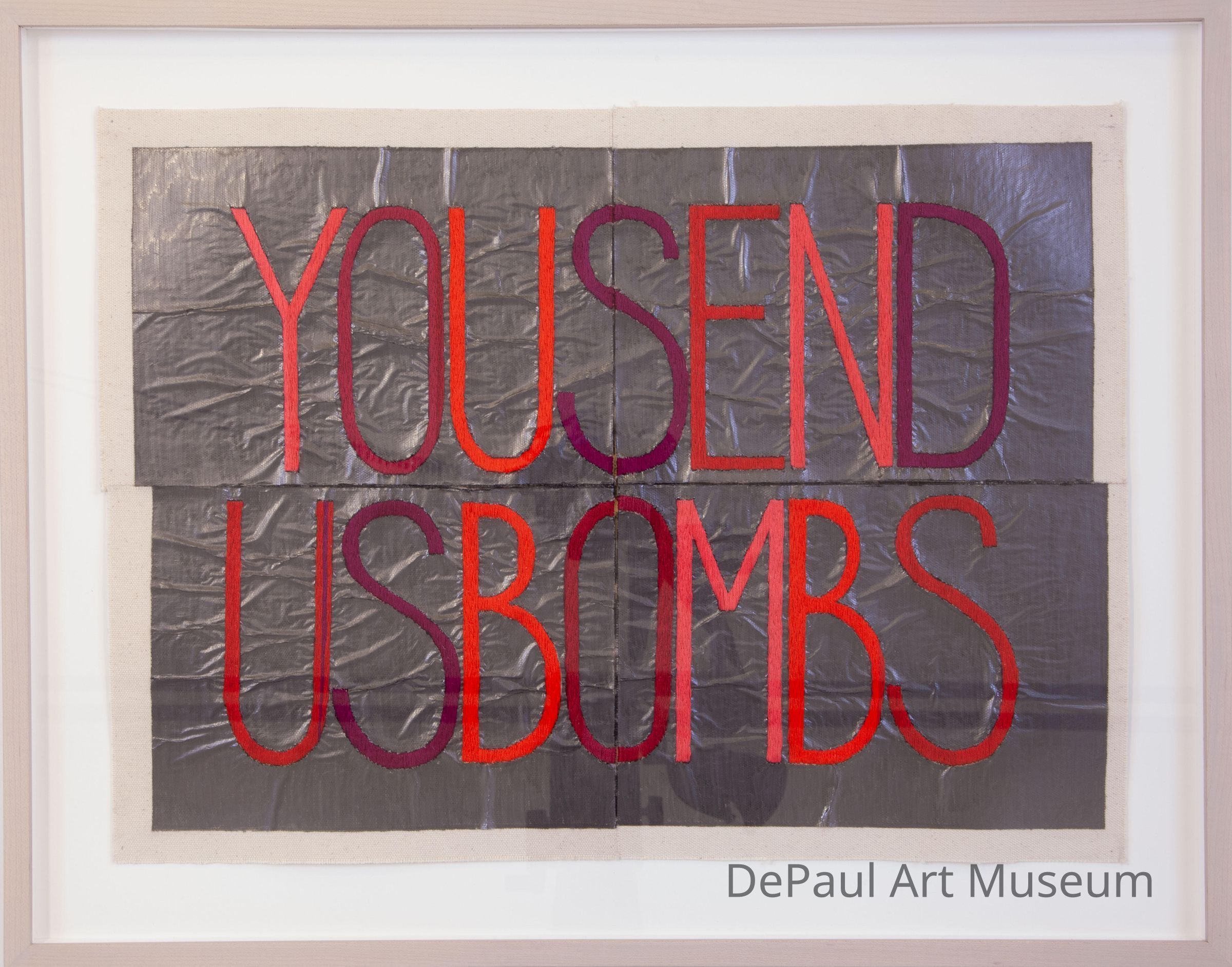 Silver background with large red/purple letters "You Send US Bombs"Artwork Details