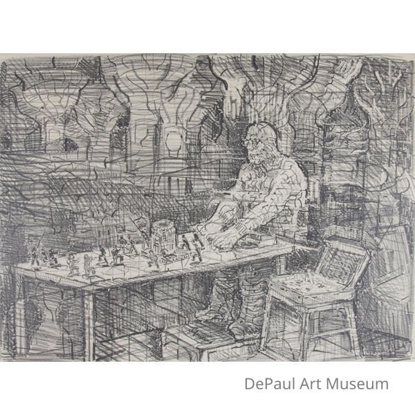 Composition in grayscale with thick, textured lines of man sitting at a table with mininature figuresAcquisition