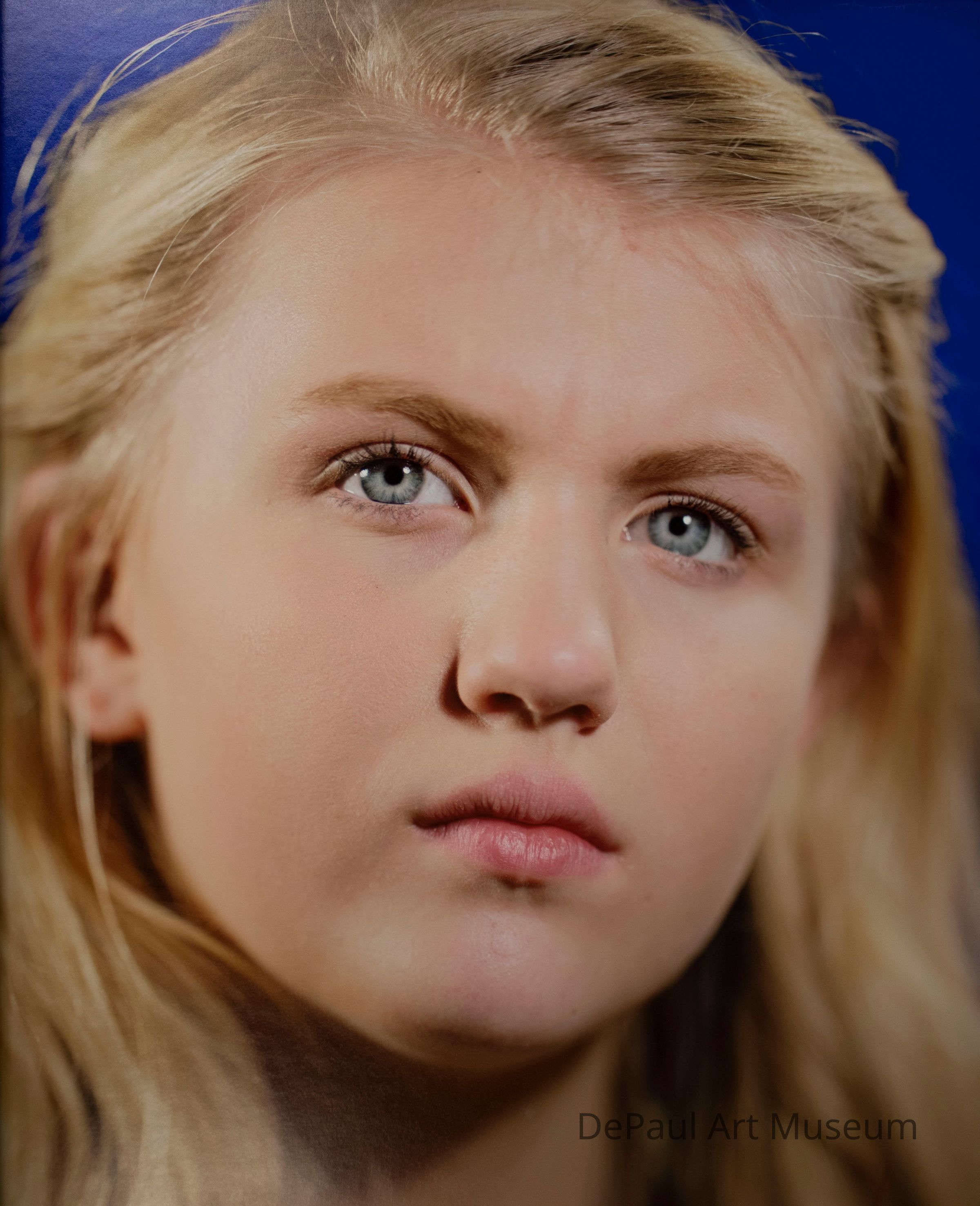 Portrait of a girl with blonde hair and blue eyes. Her face is tilted slightly and she looks up. Her hair is partially pulled back. She sits in front of a blue background.Context