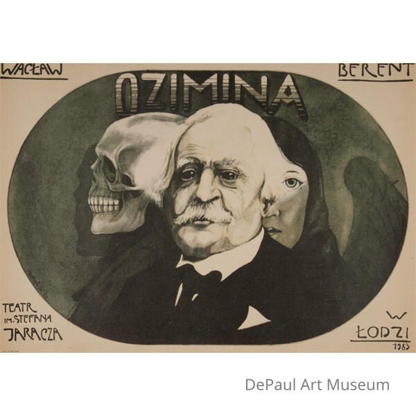 This is a greyscale Polish theater poster advertising the play Ozimina. Encased in a horizontal oval is a man’s head morphing on the left side into a skull, and on the right side into a woman’s head. Above their heads reads “Ozimina” in bold text. There are inscriptions on all four corners of the poster, with the top left and right reading “Wacław Berent” when joined. Berent is the author of the original novel Ozimina (1911) of which the play is adapted. The bottom corners’ inscription joined read “Teatr im. Stefana Jaracza w Łodzi,” which is the theater the play was performed in.