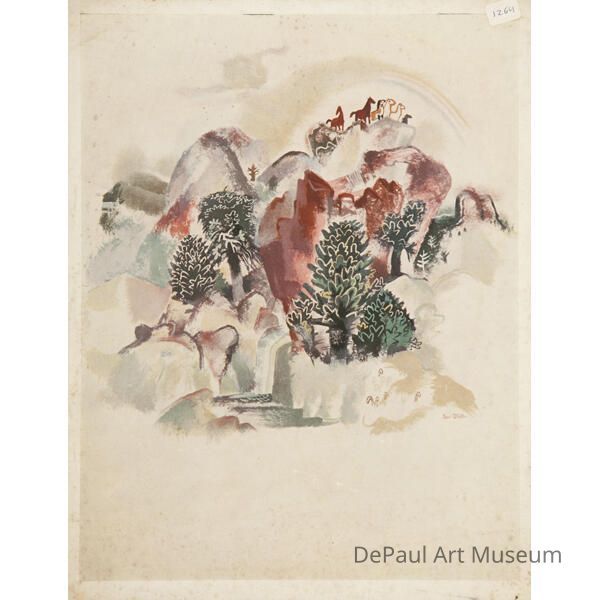 A scene with four trees on different mountain levels. On top of tallest mountain are six horses under a rainbow.Acquisition