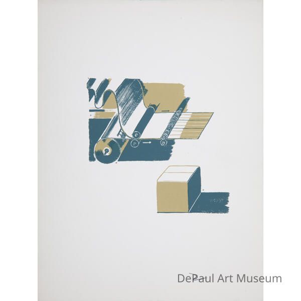 Colored image of a factory line with a box in lower right hand corner of image.Artwork Details