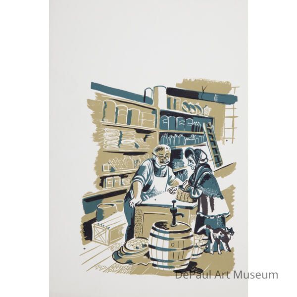 Older man and woman in general store setting bartering over goods.Artwork Details