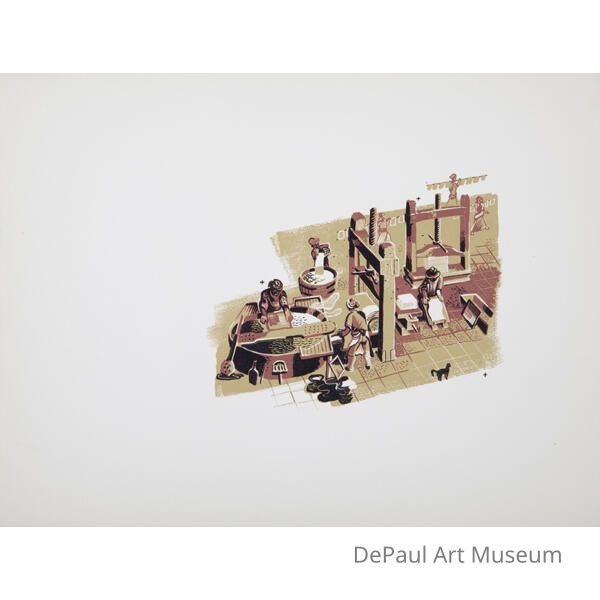 Scene of workers mixing vats of liquid and carrying sheets of paper.Artwork Details