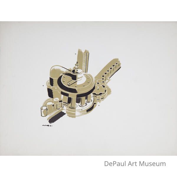 Green, black, and white image of a ccog and factory line.Artwork Details