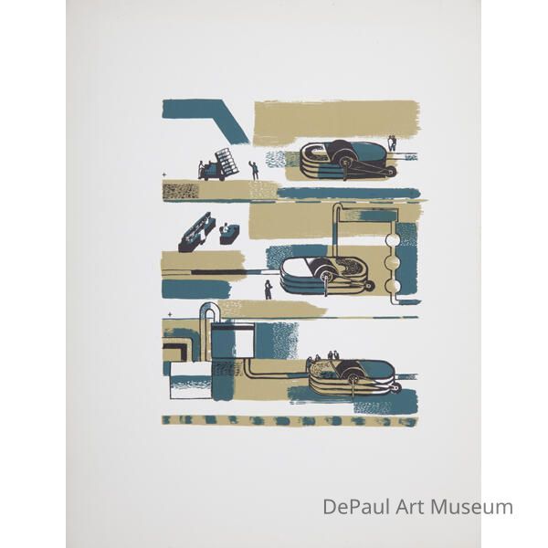 Scene of factory workers on three levels in green, blue, black, and white.Artwork Details