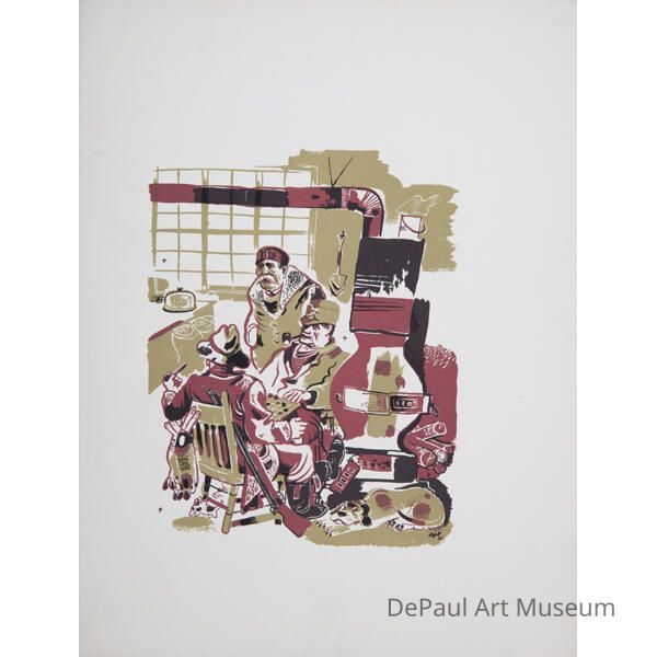 Three men gathered around wood burning stove, two playing checkers and smoking pipes.Artwork Details