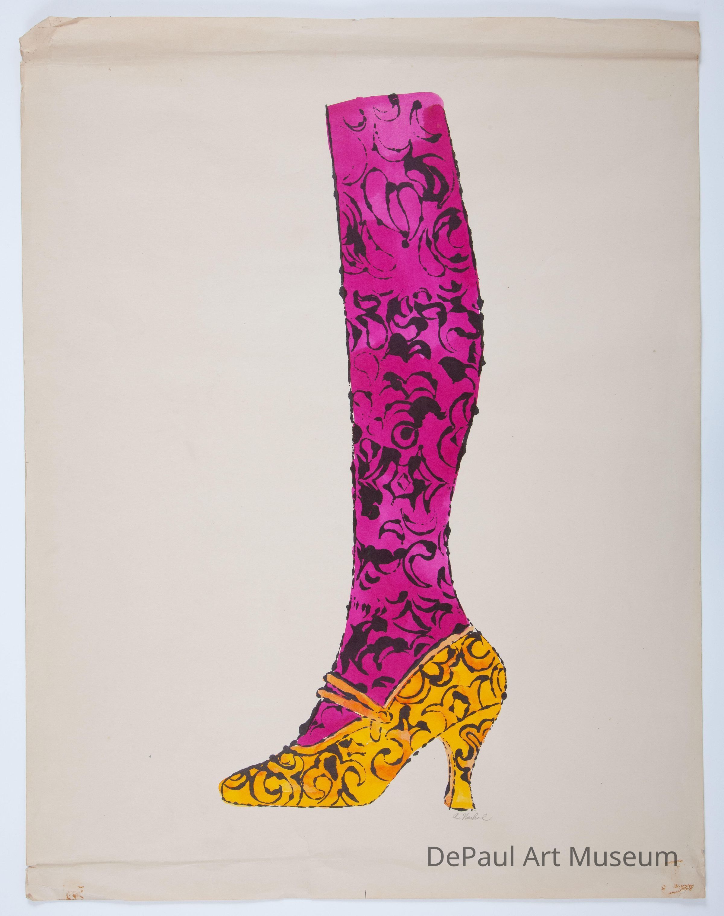 The collection of works here date from the early to mid 1950s, the period when Warhol was primarily producing illustrations for the shoe manufacturer Israel Miller. Warhol’s colorful designs depict shoes and boots adorned with gold leaf, embossed foil, and decorative cut outs. Beneath each design is scrawled a pithy phrase or aphorism such as à la recerche du shoe perdue, a reference to Marcel Proust’s magnum opus A la recherche du temps perdu. Other works in this collection depict the chic and fashionable city dwellers Warhol would have seen on the streets and at parties upon first moving to New York.