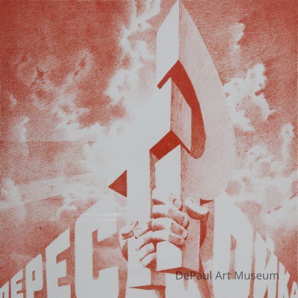 Two rows of Russian language characters in two point perspective meeting in foreground with stylized hammer and sickle held up by hands with clouds in the background, done in red-orange color.Artwork Details