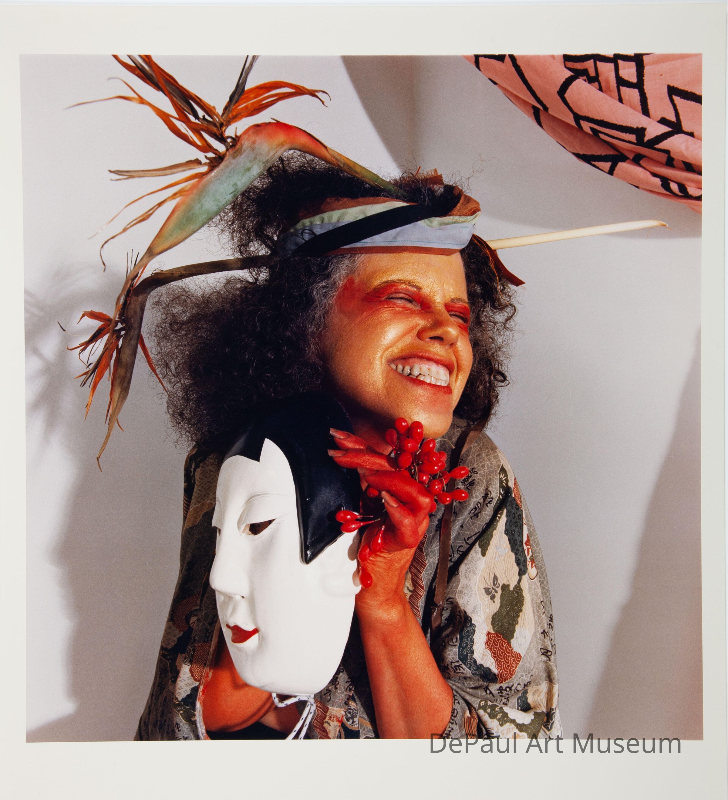 Photograph of Chicago artist Phyllis Bramson with Kabuki mask. Bramson holds red berries in red stained hands and has birds of paradise flowers arranged in her hair. She is smiling with her eyes closed.Context
