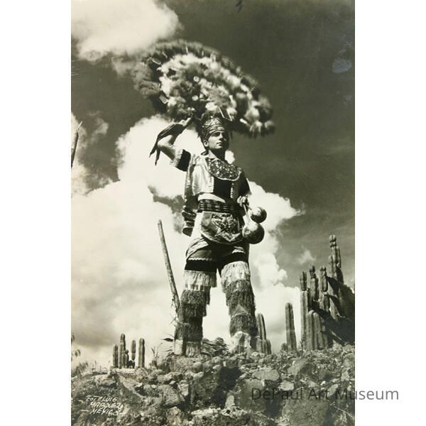 Plume Dancer Marquez, Luis ca. 1930s Man in traditional Native American costume standing above the viewer in a stony outcropping with cacti.