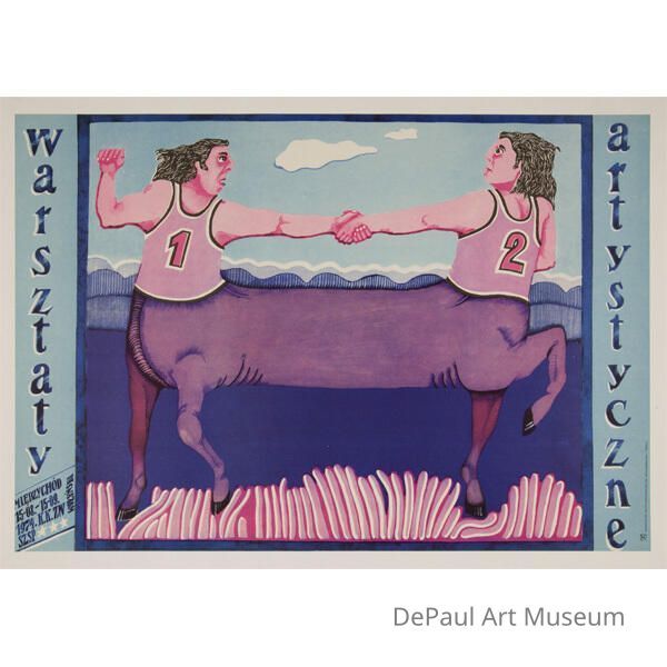 two purple centaurs in pink jerseys with "Warsztay artstyczne" reading vertically down sides. Other. Exhibition.