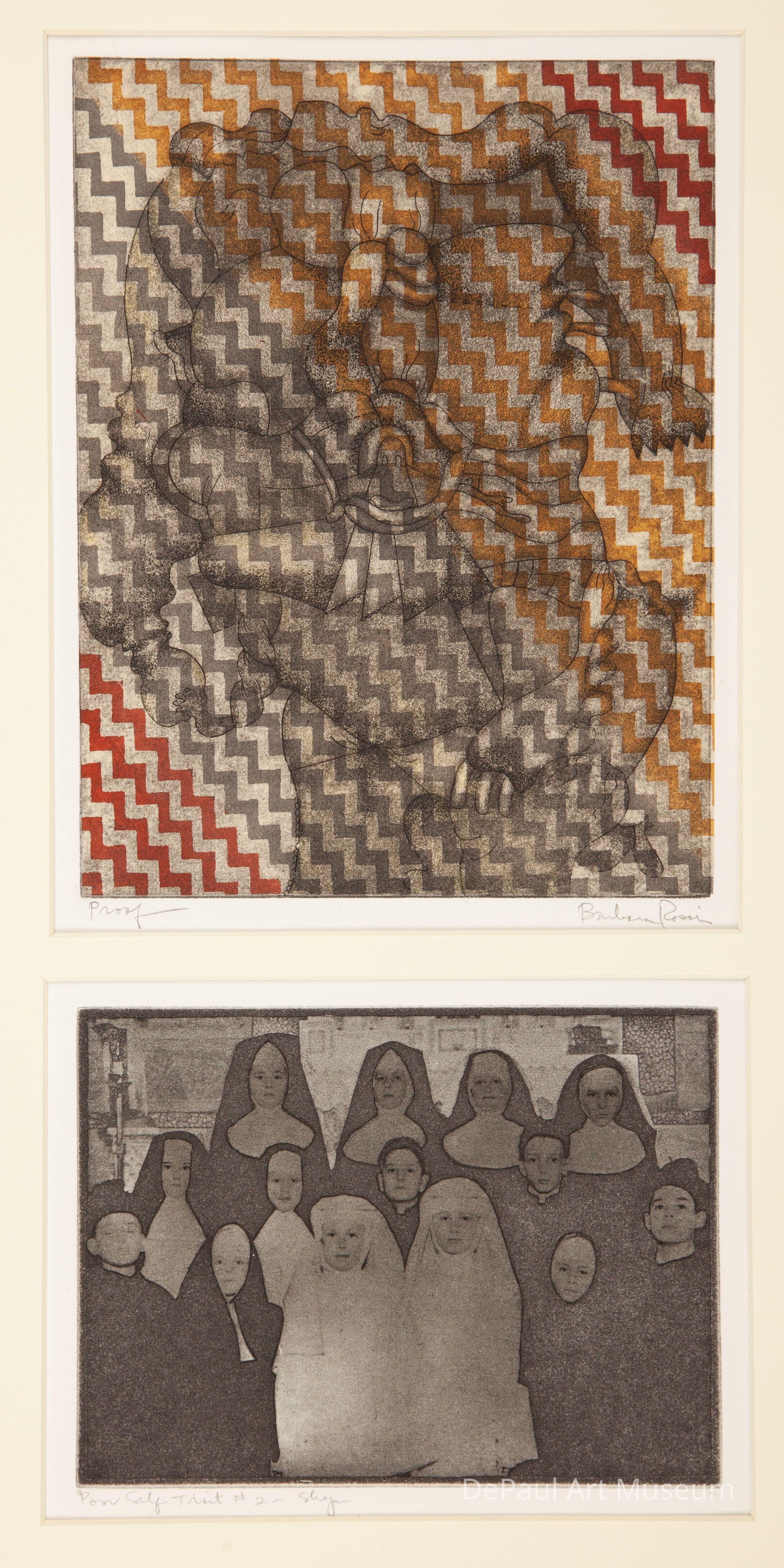The three sets of artist’s proofs here are taken from Rossi’s 1970 series Poor Self Traits, a title which puns on “self-portrait.” In these works, Rossi juxtaposes photographs from her personal life—in this case, a photograph of herself amongst the Catholic nuns with whom she was affiliated in the late 1960s—with one of her signature drawings. The photographic portion, which is printed in the negative with the figures cut out and reprinted in transparent ink, suggests a spectral, ghost-like quality, making the seemingly more realistic photographic medium now appear more surreal than the abstract self-portrait at the top.Acquisition