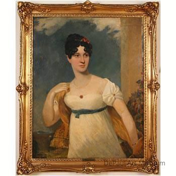 Portrait of a woman from lower body up. Woman is wearing a white dress with a gold shawl. Background of the image is a blue sky with white clouds at the top and a column on the far right. Image is in a gold frame.Acquisition