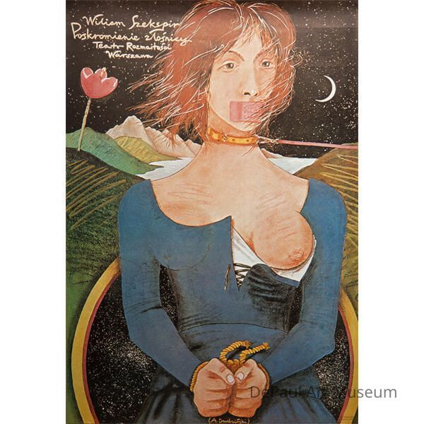 Theater poster for Shakespeare's "Taming of the Shrew" depicting a bound, gagged, and tied up woman in blue dress with exposed breast before a night-time mountain scene.Artwork Details