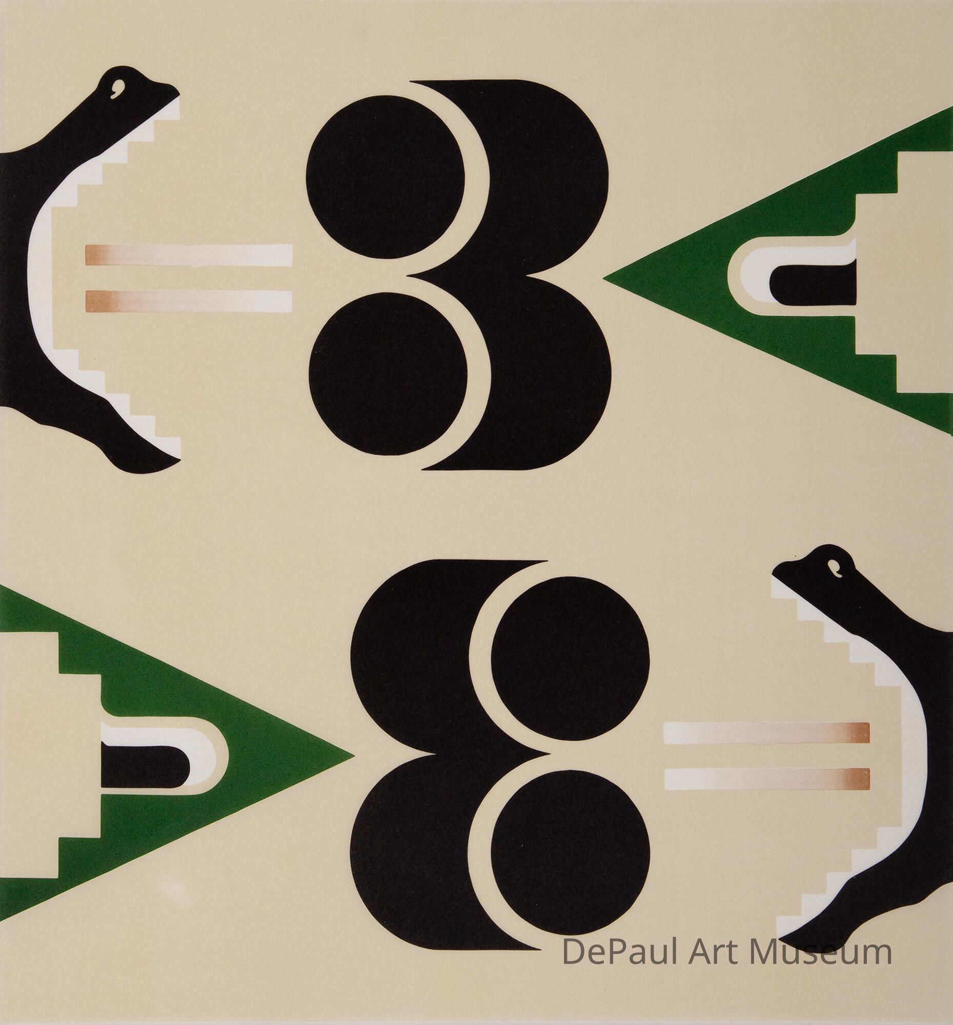 Light yellow background with two large shapes in the center that look like the number 3. Triangular shapes on each side of the 3's that look like alligators.Context