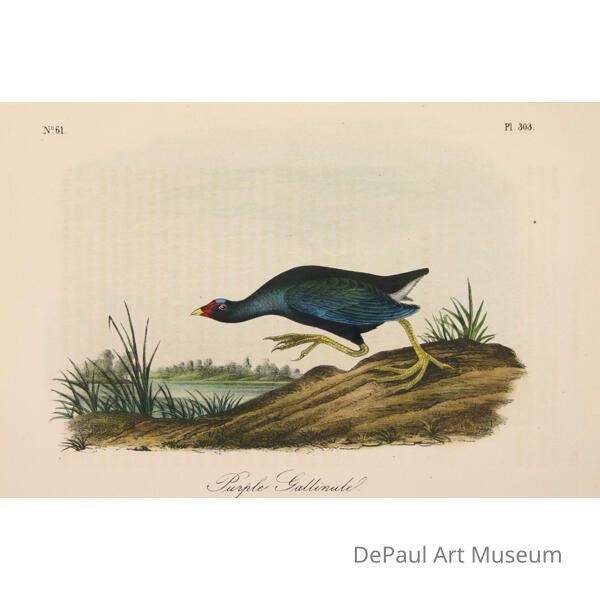 John J. Audubon’s (1785-1851) book ‘Birds of America’ was originally printed with “Double Elephant folio” engravings, meaning 435 life size images of North American birds. Between 1840 and 1869, several editions of a smaller (“octavo”) version of the book were printed. The prints found in DePaul’s collection are from this later era, and were printed by J.T. Bowen in Philadelphia. Bowen used a “camera lucida” to project the large engravings on lithographic stone which was then hand drawn and hand painted using watercolors. These smaller sized books made Audubon’s work accessible to a wider audience, and helped his art gain the reputation it still holds today.Acquisition