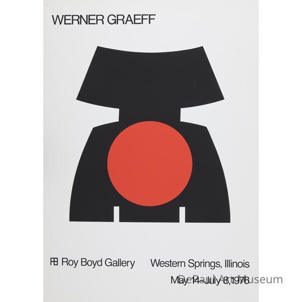 Poster with artists name at top/gallery information at bottom; Black shape with red circle in center.Acquisition