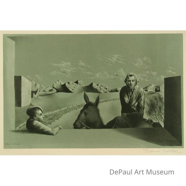 Gray-green depiction of a woman, young boy, and donkey in a desert landscape framed by geometric formsArtwork Details