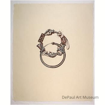 A duck, a Mexican mask, domino, and a rabbit are interlocked with an ouroboros, an ancient symbol depicting a serpent eating its own tail. Benito Huerta connects seemingly unrelated yet deeply personal images to create a new meaning of “wholeness” and “rebirth,” as well as create a new aesthetic for Mexican empowerment. According to the artist, these images are “about my hybrid Anglo-Latin heritage as well as my relationship to popular culture, friends, family, and even the students I teach.” They also embody survival and defiance of artistic convention and negative socioeconomic considerations of race and class.