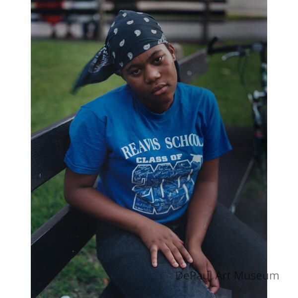 Rochey Bey, Dawoud 2001 Young African American woman in blue tee shirt and head scarf sitting on a bench and staring into camera