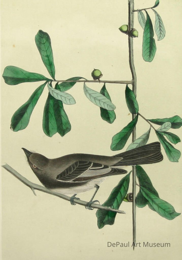 John J. Audubon’s (1785-1851) book ‘Birds of America’ was originally printed with “Double Elephant folio” engravings, meaning 435 life size images of North American birds. Between 1840 and 1869, several editions of a smaller (“octavo”) version of the book were printed. The prints found in DePaul’s collection are from this later era, and were printed by J.T. Bowen in Philadelphia. Bowen used a “camera lucida” to project the large engravings on lithographic stone which was then hand drawn and hand painted using watercolors. These smaller sized books made Audubon’s work accessible to a wider audience, and helped his art gain the reputation it still holds today.Acquisition
