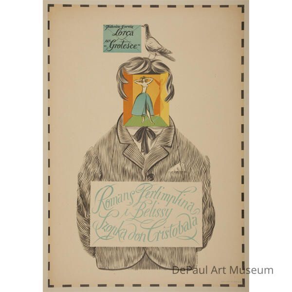 upper torso of man with bird on head and face replaced by figure of woman; text reads "Federico Garcia, Lorca w Grotesce," and "Romans Perlimplina i Belissy Szopka don Cristobala"