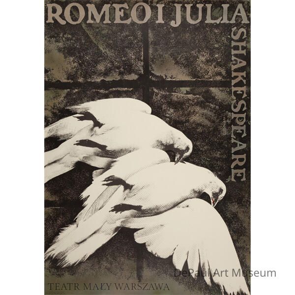 This is a poster for a theatrical production of Romeo and Juliet. It depicts two white doves, done in screenprint-like technique before brown-gray windowpane. This design reflects the themes of the play.Artwork Details