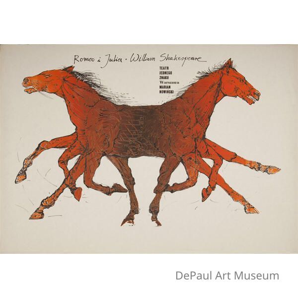 This is a poster for the production of Shakespeare’s Romeo and Juliet. It shows two red-orange horses with their torsos combined into one animal, running in opposite directions.Artwork Details