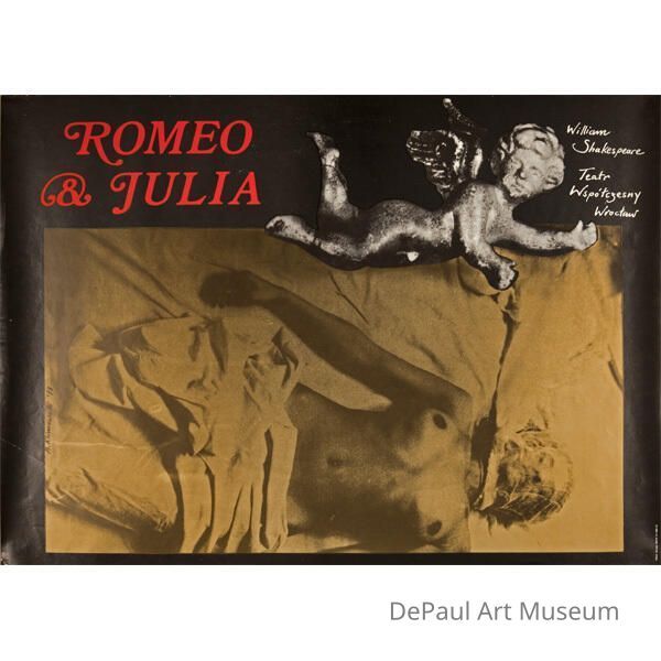 This artwork is a poster for a theatrical production of Romeo and Juliet. It depicts a nude female body lying on a bed with sheets covering her face and lower body. There is a grayscale image of a winged putto hovering over him.Artwork Details
