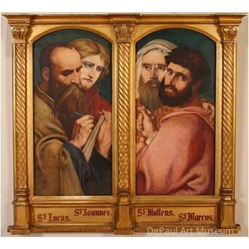 Two panels, each depicting portraits of the apostles Matthew, Mark, Luke and John against a blue background. In a gold frame with names of the saints in red at the bottom.Acquisition
