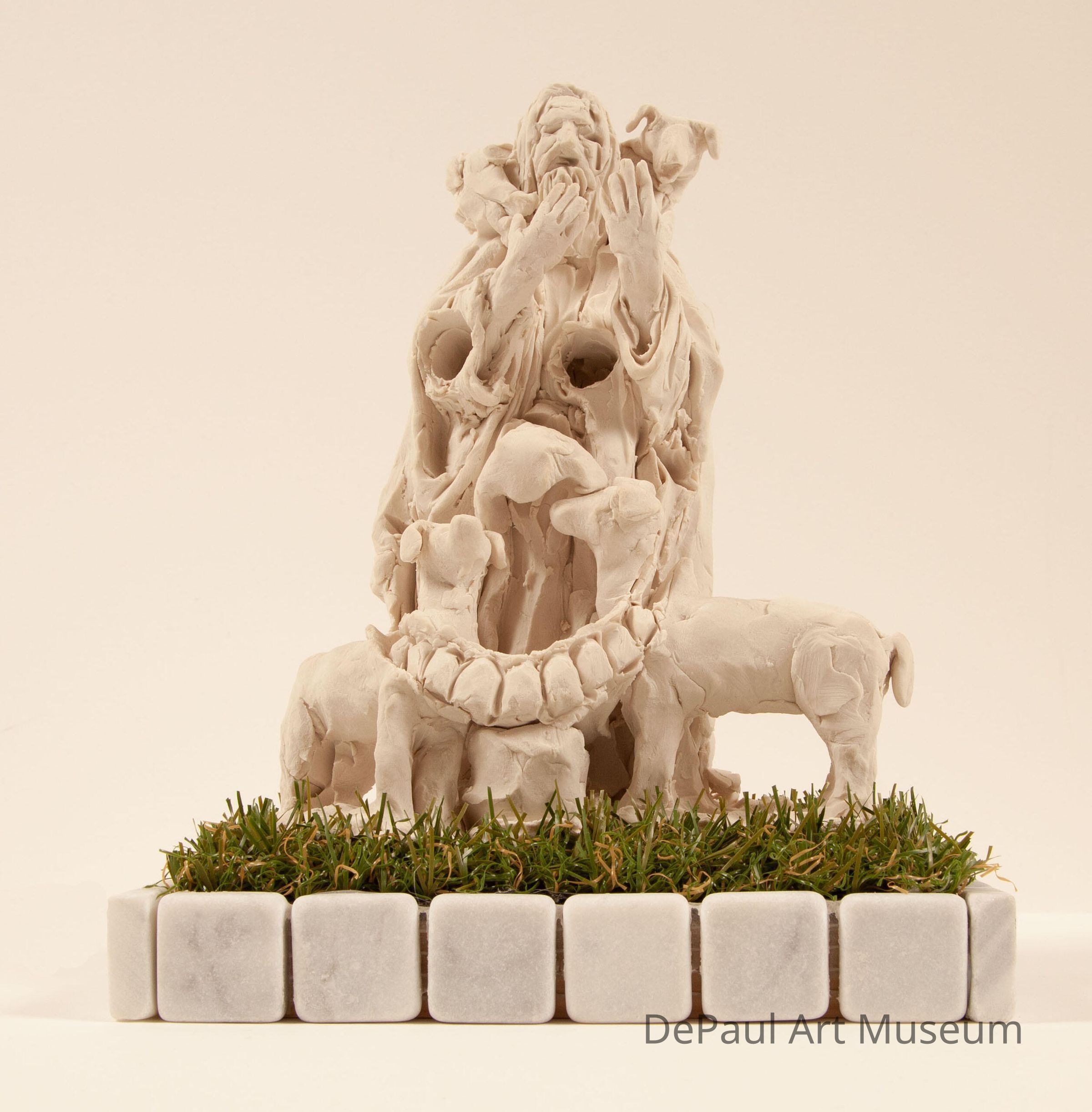 Sculpture of a man with three dogs, two at his feet and one around his shoulders. The man holds his hands out in from of him with an open-mouthed expression on his face. There are two holes on the statue, one on the figure's arm and the other on his chest. The man and dogs stand on astroturf.Artwork Details
