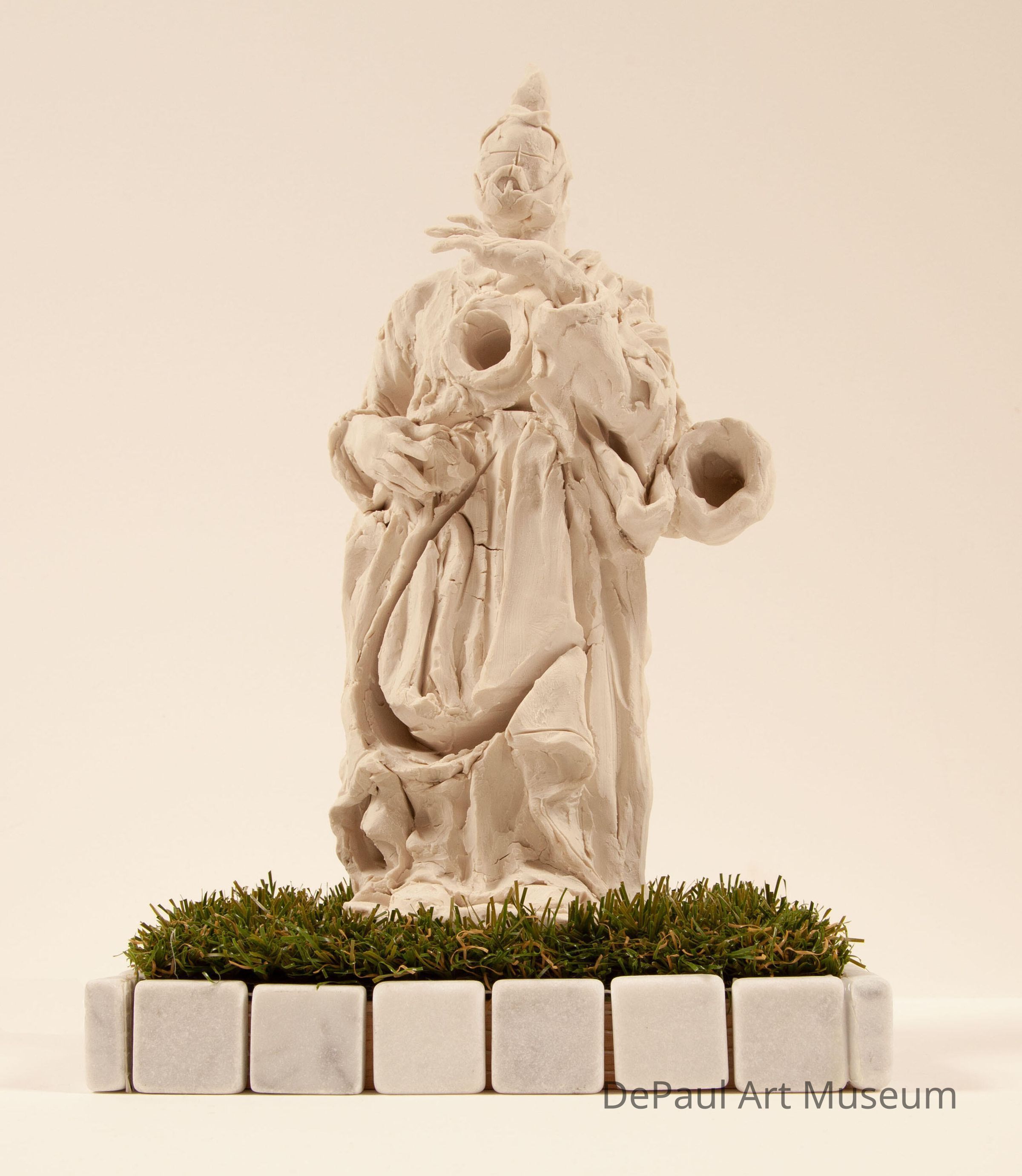 His use of found materials within his compositions, such as fake grass, tile, animal hide, and percussion instruments is reminiscent of the aggregate components found at temporary gravesites in Mexico, or at the site of tragedies in the States: lovingly placed personal items that create portraits of the deceased as memorialized by their loved ones. These artworks, however, are a rebuilding or restructuring of general bodies through the materials. As we constantly grow and reinvent ourselves, individually and as a human race, these ephemeral materials set in contrast to the longevity of the artist’s clay sculptures become memento moris, or “reminders of death,” prompting us to celebrate the complexities of our ephemeral lifetimes and their lasting impacts.Acquisition