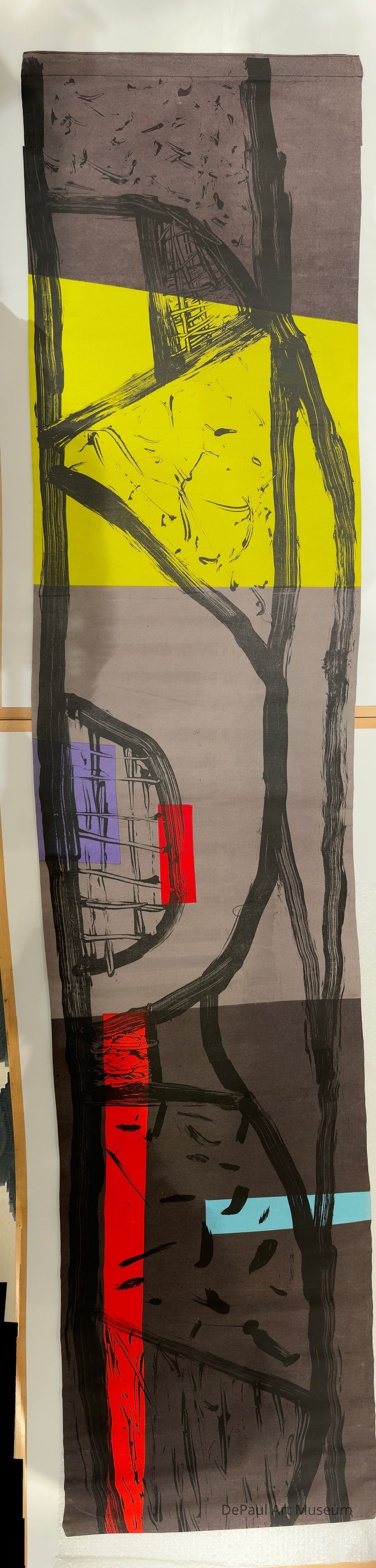 Images were drawn directly onto transparent paper or film then exposed by light to silk-screens and printed onto black and white cloth. Additional shapes were layered on top using a blank open screen and cut paper stencils. These analog processes reveal the urgency and immediacy of the drawings. The images printed on black cloth were limited to a monochromatic pallet, and on the white cloth, fields of saturated color were printed. The cloths are double sided sewing one black surface to a white. The lengths of fabrics were installed with the black side facing the viewer. As the viewer moves amongst and around the work, color reveals itself, declaring a return to a vibrant pallet not seen in my work for many years." - Fraser TaylorAcquisition