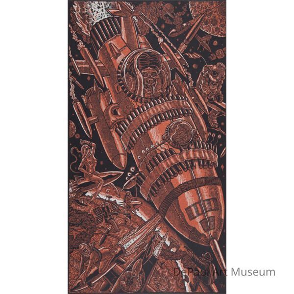 Stylized missle armed with dynamite piloted by an alien through space surrounded by various astronauts in red and black.
