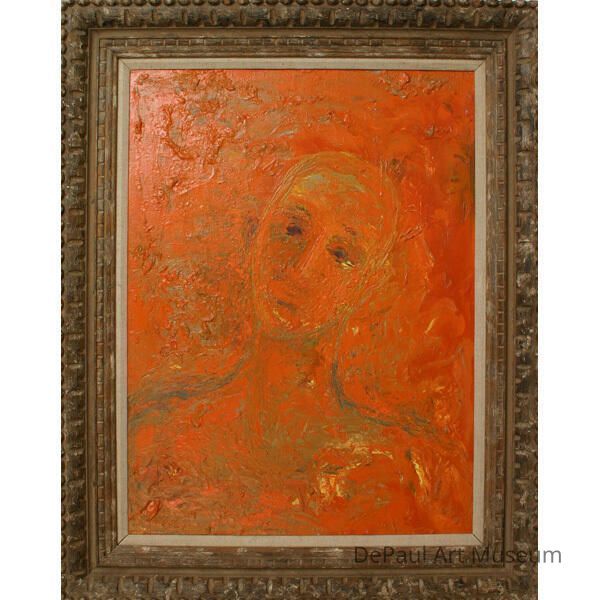 Primarily orange composition of a man from the shoulders up. Thick elevated paint.