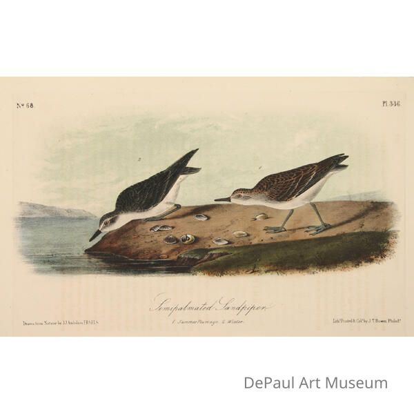 John J. Audubon’s (1785-1851) book ‘Birds of America’ was originally printed with “Double Elephant folio” engravings, meaning 435 life size images of North American birds. Between 1840 and 1869, several editions of a smaller (“octavo”) version of the book were printed. The prints found in DePaul’s collection are from this later era, and were printed by J.T. Bowen in Philadelphia. Bowen used a “camera lucida” to project the large engravings on lithographic stone which was then hand drawn and hand painted using watercolors. These smaller sized books made Audubon’s work accessible to a wider audience, and helped his art gain the reputation it still holds today.Acquisition