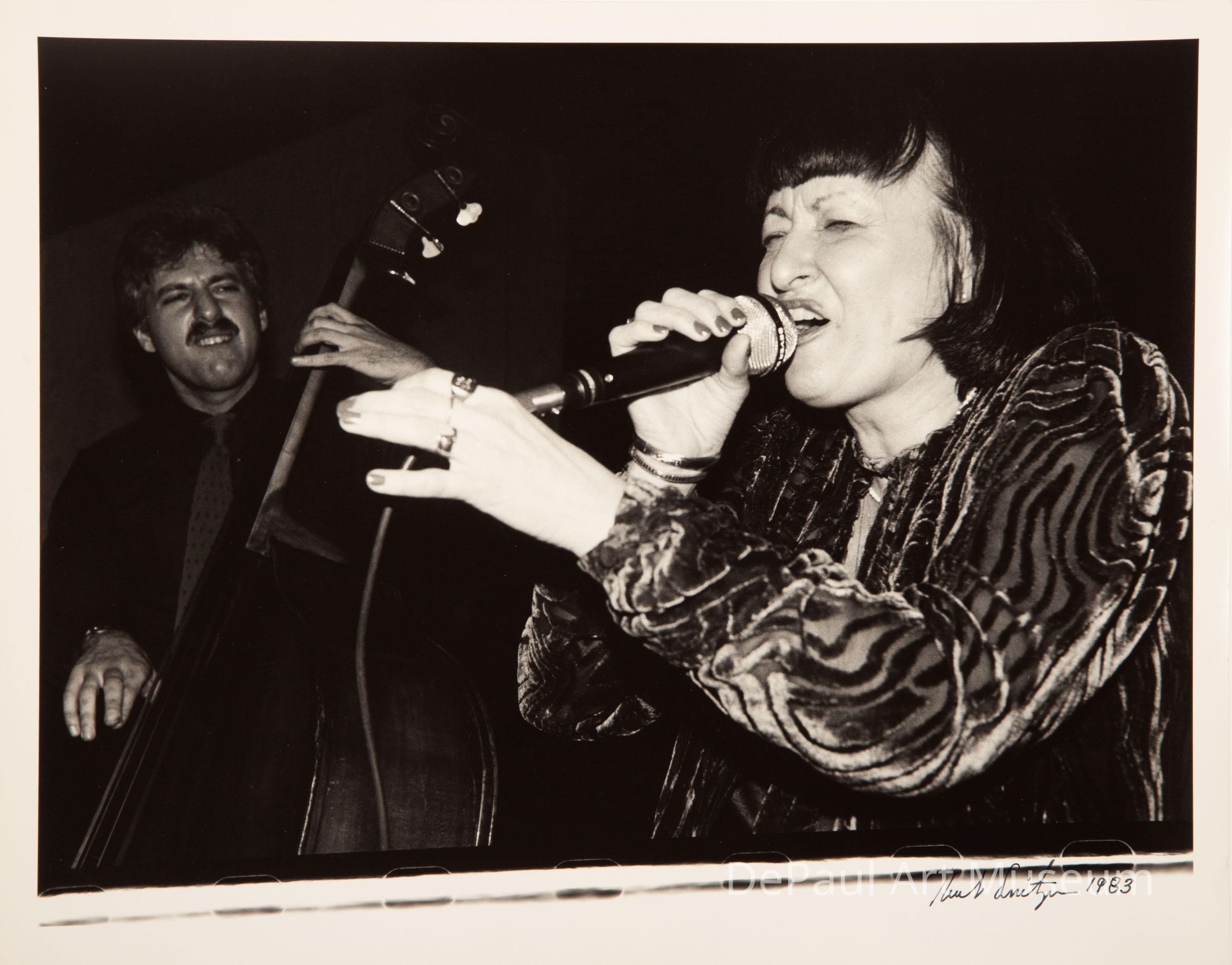 Sheila Jordan with a microphone, singing. Behind her is a man playing the bass, likely Harvie Swartz.