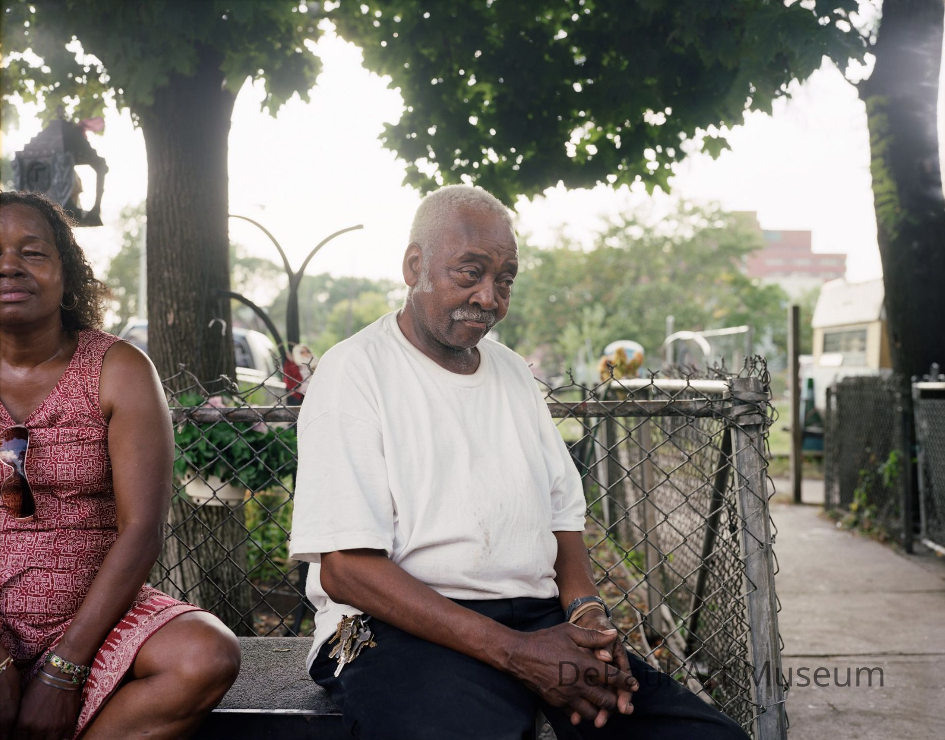 Older African-American male wearing white tee shirt and black pants sitting on a bench outside against chian-link fence with hands in his lap, looking away from viewer.