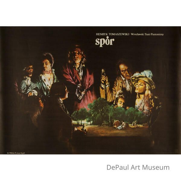 This is a Polish theater poster advertising the play Spór. The majority of the composition is sourced from Joseph Wright of Derby’s painting An Experiment on a Bird in the Air Pump, in which a group of people are huddled around a central point. In Aleksiun’s interpretation, he has collaged another smaller scene of trees (with even smaller people) as the focal point that Wright’s characters are focusing on. The inscription in the top right corner names the play (Spór), the director (Henryk Tomaszewski), and the theater (Wroclawski Teatr Pantomimy). Theater Poster.Context