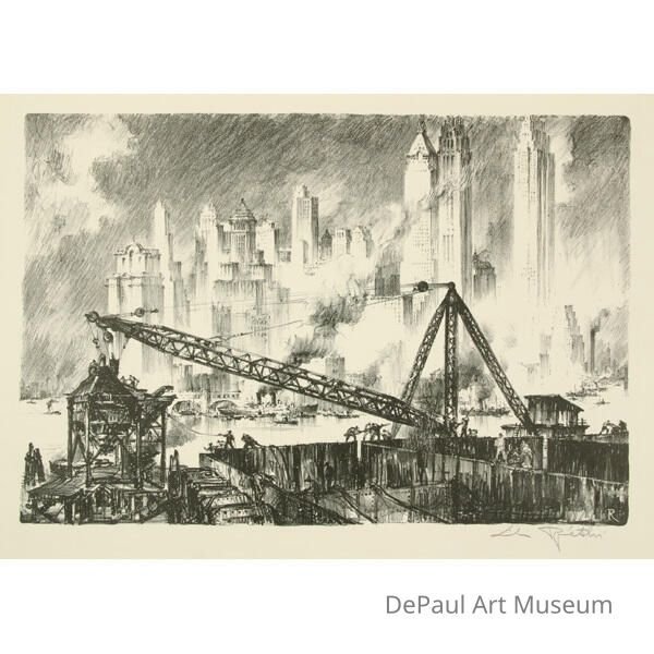 Crane and other industrial equipment in front of city skyline and body of water, rendered in sketchy styleAcquisition