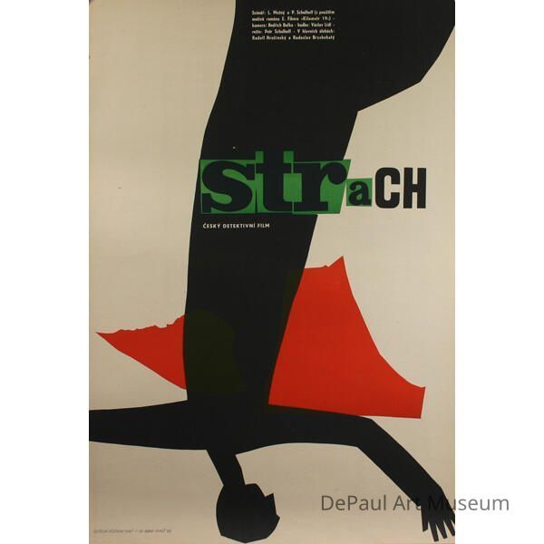 Black silhouette of a person upside down with open arms and red around the body. Czech film poster. Cinema.