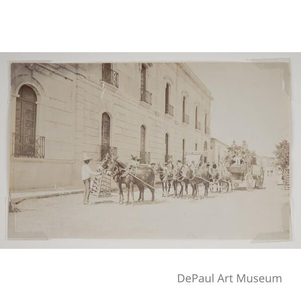 Street scene of a horse-drawn carriage halted in front of a large stone building.Acquisition