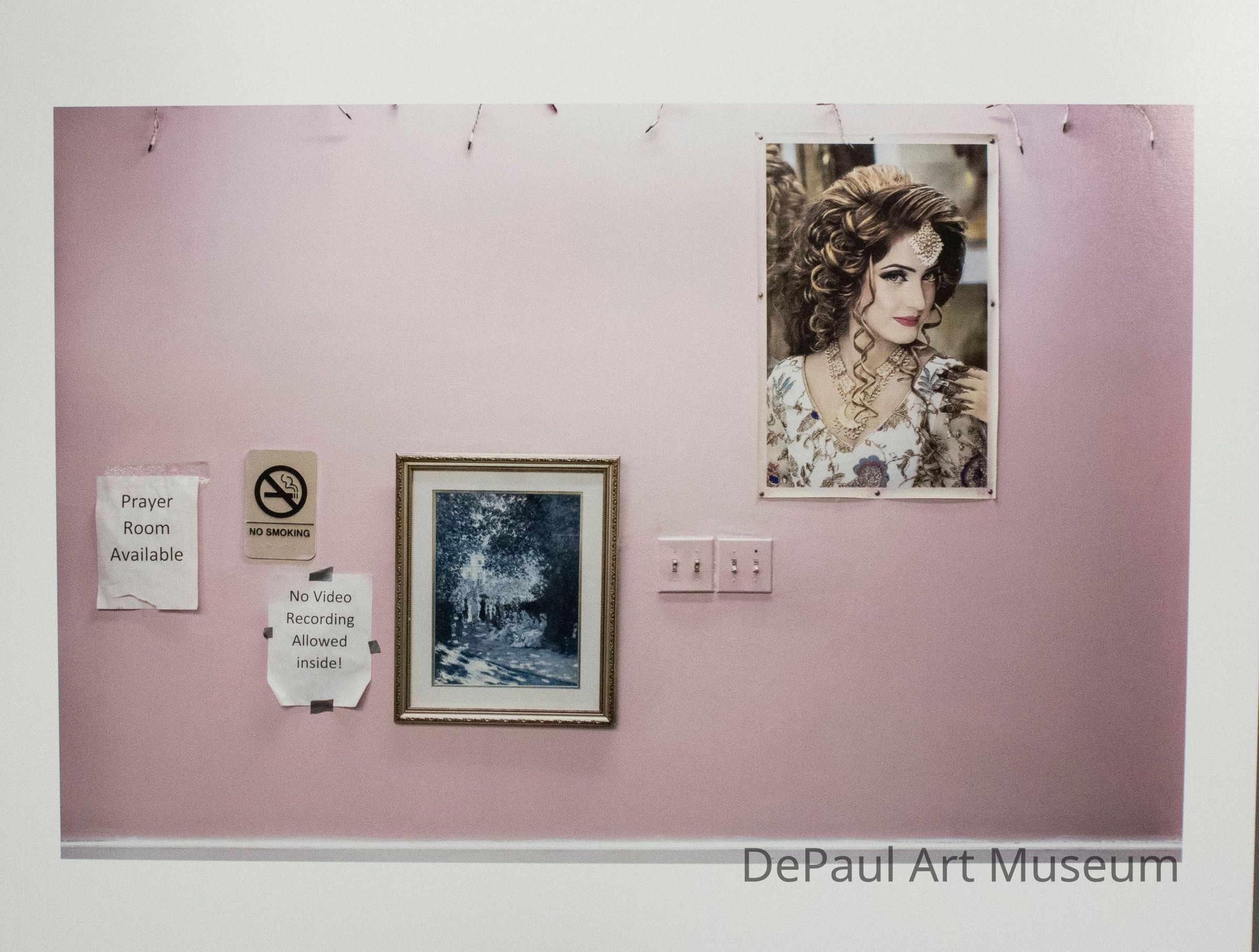 Photograph of the interior of Super Clips Salon in Chicago's Little India neighborhood. The photo shows a light purple wall with lights strung at the top, a photograph of a woman pinned up, a painting hung, and three signs noting various policies and that a prayer room is available for patrons.Context