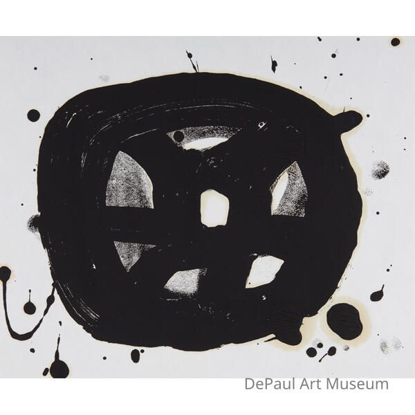 A dark circle with patches of white in the center surrounded by dots and blobs of paint.Artwork Details