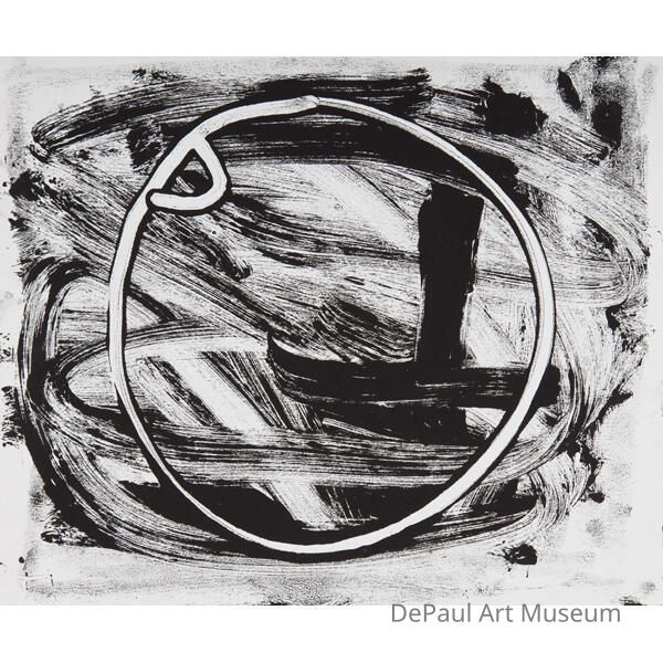 A white circular border with patchy black brush strokes inside it.Artwork Details