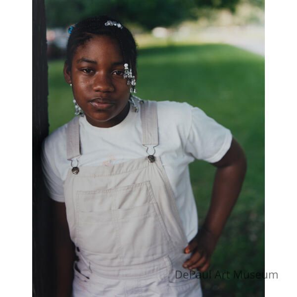 Tanita Bey, Dawoud 2001 African American girl in white tee shirt and overalls, leaning against a tree with her hand on her hip and staring into camera
